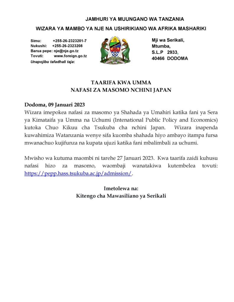 Wizara ya Mambo ya nje na ushirikiano wa Afrika Mashariki, imeendelea kufuatilia na kutangaza fursa mbalimbali zikiwemo za masomo nje ya nchi. Wizara imekuwa ikitumia tekinolojia ya tehama kufikisha taarifa kwa wananchi wengi.
